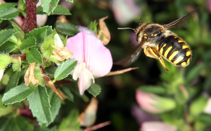 Wollbiene - Anthidium manicatum Zurück zur Seite mit dem Titel „Wollbienen“ Weibliche Wollbiene (Anthidium manicatum) im Anflug auf eine Blüte des Hauhechels (Ononis spinosa). Männliche Wollbienen besitzen fünf sehr kräftige Dornen am Rand des Hinterleibs. Copyright: Joachim Eberhardt (Agentur lernsite),
