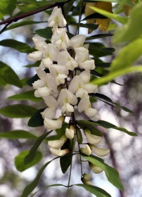 Die weißen, zwittrigen Blüten sind in hängende Trauben als Blütenstände zusammengefasst. Die typischen Schmetterlingsblüten bieten reichlich Nektar. Setzt sich eine Biene auf die Blüte, tritt zuerst die Narbe heraus, um eventuell mitgebrachten Pollen vom Bauch der Biene abzunehmen.