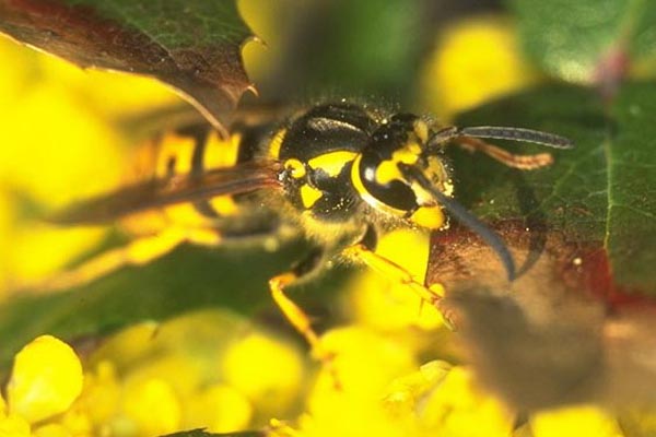 Die Blüten der Mahonie bieten den Wespenköniginnen erste kohlenhydratreiche Nahrung, wenn sie ihre Überwinterungsquartiere verlassen und mit dem Aufbau eines neuen Volkes beginnen. Das Bild zeigt die Königin einer Deutschen Wespen (Paravespula germanica).