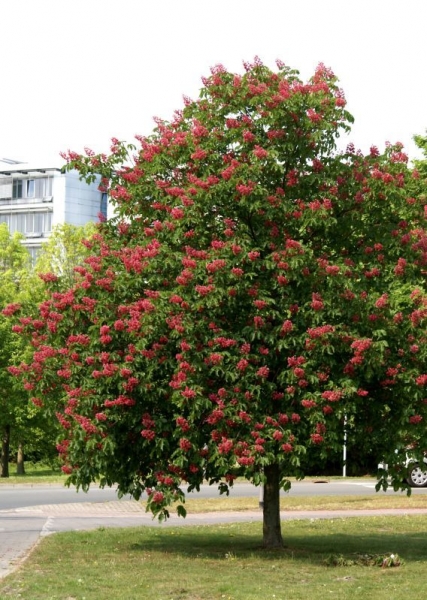 Die Rote Rosskastanie hat eine kompakte und rundliche Krone. Die Blüten sind zygomorph und rot. Copyright: Werner Mühlen (Landwirtschaftskammer NRW),