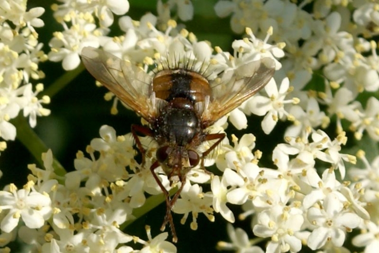 Der Schwarze Holunder lockt mit seinen kleinen Blüten vor allem Insekten mit nur kurzem Rüssel an. So reicht die dargebotene Menge an Nektar für diese Schwebfliege aus.