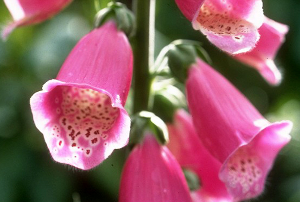 Fingerhut (Digitalis purpurea) ist ein guter Nektarspender für die Bienen. Die glockenförmigen Einzelblüten öffnen sich nach unten. Die Staubgefäße sind daher nicht zu sehen. Man nimmt an, dass die farbigen Flecken auf der Unterseite der Blüte Saftmale sind, die Bestäubern eine reiche Nahrungsquelle vorgaukeln sollen.