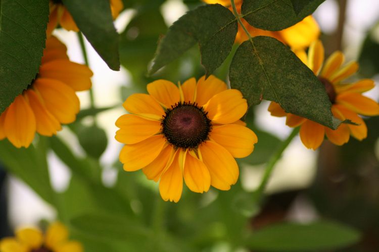 Der Gewöhnliche Sonnenhut (Rudbeckia fulgida) hat strahlend-gelbe Zungenblüten, die im Kontrast stehen zu den braun-gefärbten Röhrenblüten. Der Blütengrund ist leicht erhöht.