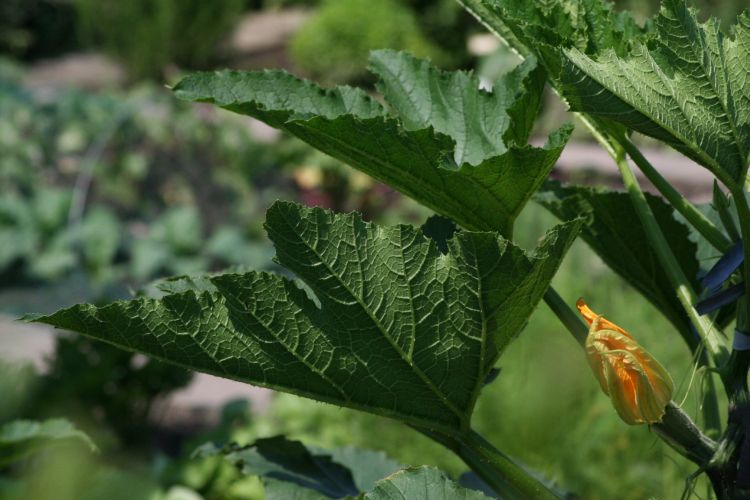 Die funfzähligen gelben Blüten der Zucchinipflanze sind tagsüber geschlossen und nur von den späten Abendstunden bis in die frühen Morgenstunden geöffnet. Die Blätter sind am Rand gekräuselt und denen der übergeordneten Kürbisarten sehr ähnlich.