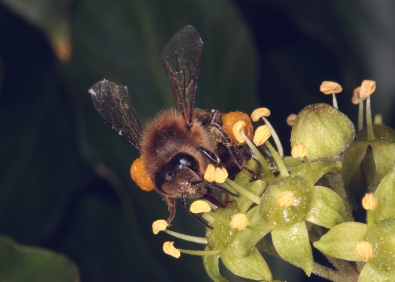 Unauffälliger geht es kaum: Die Blüte des Efeu verzichtet auf große, bunte Kronblätter; sondern die Kronblätter sind kurz, gelbgrün und dickfleischig. Es gibt grünliche Kelchblätter und Staubblätter mit zwei gelben Pollensäcken als farbige Tupfer. Der Griffel ist kurz und der mittelständige, fünfkammerige Fruchtknoten ist ein mit Drüsen übersäter Diskus.