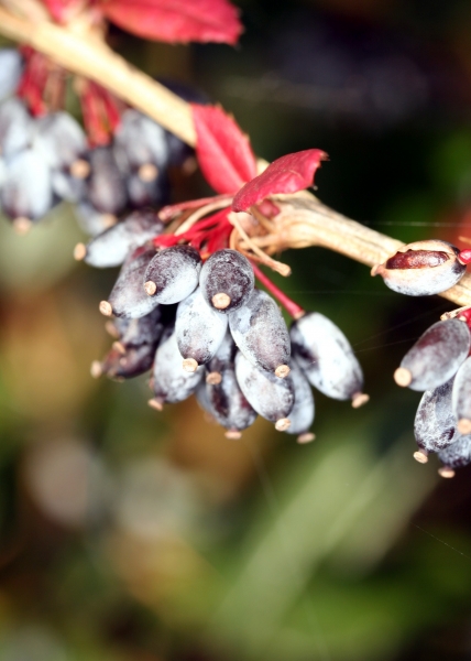 Typisch für die schwarzen bis dunkelblauen Früchte der Berberitzen ist der reifartige Überzug. Auf dem Foto sind junge Blätter im Austrieb zu erkennen. Typischerweise zeigen sie diese Kupfer-Farbe.