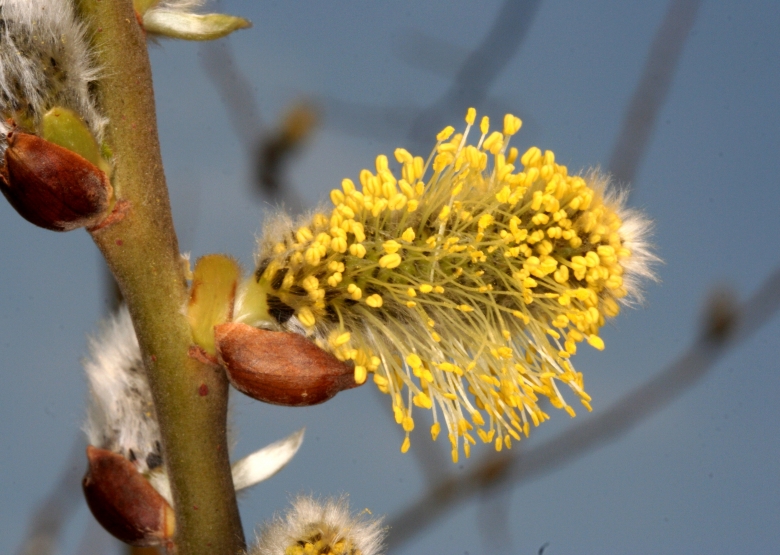 Eine männliche Blüte einer Weide, aus dem geschlossenen, pelzigen „Weidenkätzchen“ ist ein pralles Angebot an gelbem Pollen geworden. Die Weide ist neben der Hasel die wichtigste Pollenquelle für unsere Bienen im Frühjahr. Honigbienen brauchen zu dieser Zeit viel Pollen, um die Brut des jetzt stark wachsenden Volks zu ernähren.