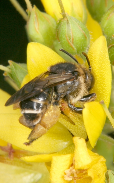 Schenkelbienen der Gattung Macropis haben sich auf den Besuch der Blüten der Gilbweiderich-Arten (Lysimachia) spezialisiert. Die Weibchen (Foto) sammeln Pollen und Öle, bereiten daraus einen festen Brei und transportieren ihn an den Hinterbeinen ins Nest. Bienen mit dieser Verhaltensweise werden als Ölbienen bezeichnet.